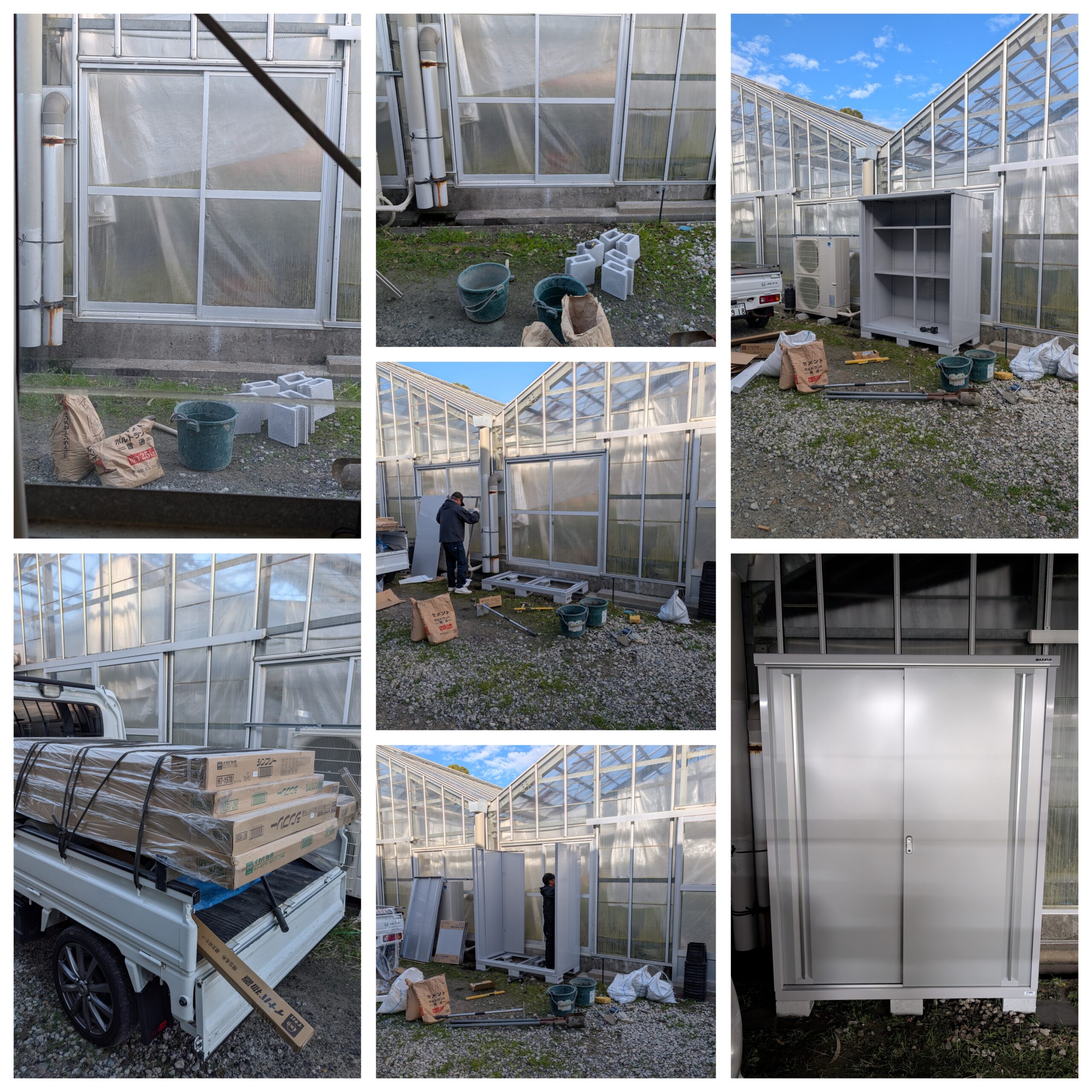 今日は朝から晴れ。気温は12°c。今日も朝からガーベラの採花と調整作業をしました。エフクリーン温室を切ってから、実習生たちが新しいガラス温室を切っている間、私と農園主と母親でLのキャップをしまくりました。8時過ぎぐらいに物置の施工業者さんが来てくれて、念願のイナバ物置を設置してくれました。⇓