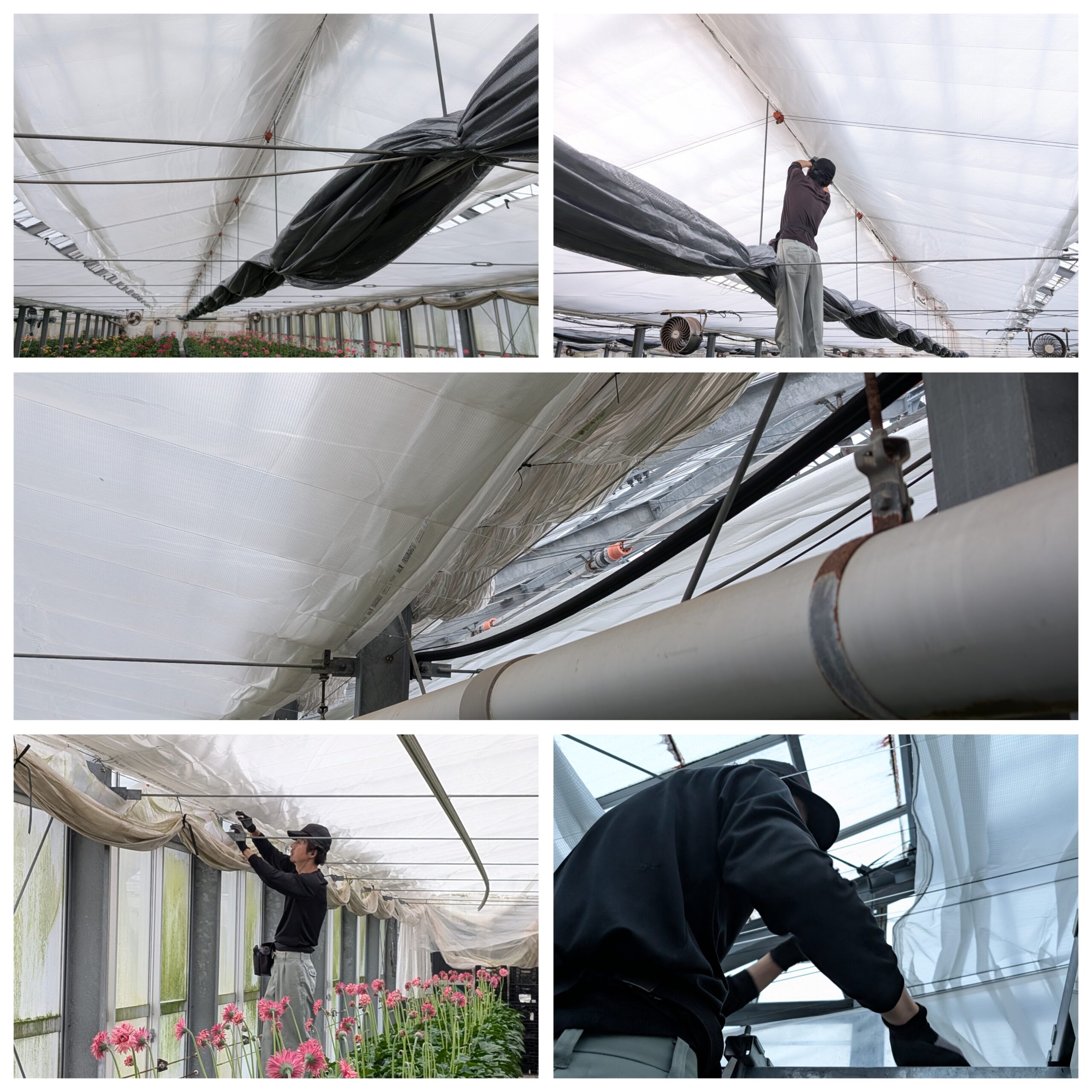 午後からは昨日の続きで、作業場の隣のガラス温室の遮光カーテンのピンサーを留めていきました。⇓