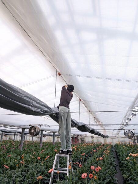 今日は朝から晴れ。気温は13 °c。今日も朝からガーベラの採花と調整作業をしました。今日は花が少なく、10時半に調整作業が終わってしまったので、実習生たちにエフクリーン温室でマロンの葉かき作業もしてもらいました。朝、花を切ってからめちゃくちゃ風が強いと思っていたら、関東と関西で木枯らし1号が吹いたみたいです。なんとなく、昼間も少し寒い気がしました。農園主は花を切ってから、新しいガラス温室の薬散をしました。もう涼しいので、空調服はいらないみたいです。