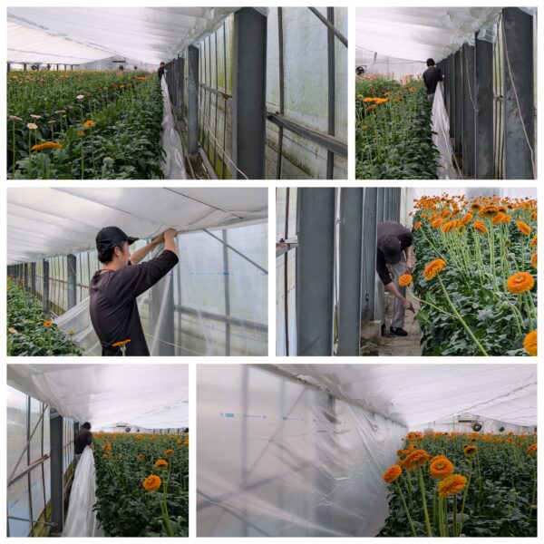 午後からは広い方の40年もの温室で、サイドの快適空乾を広げました。去年まで使っていたのを、自動カーテンを取り付けるタイミングで処分したので、今年は新品をつけました。始めに除草剤を撒いて、広げていきました。⇓