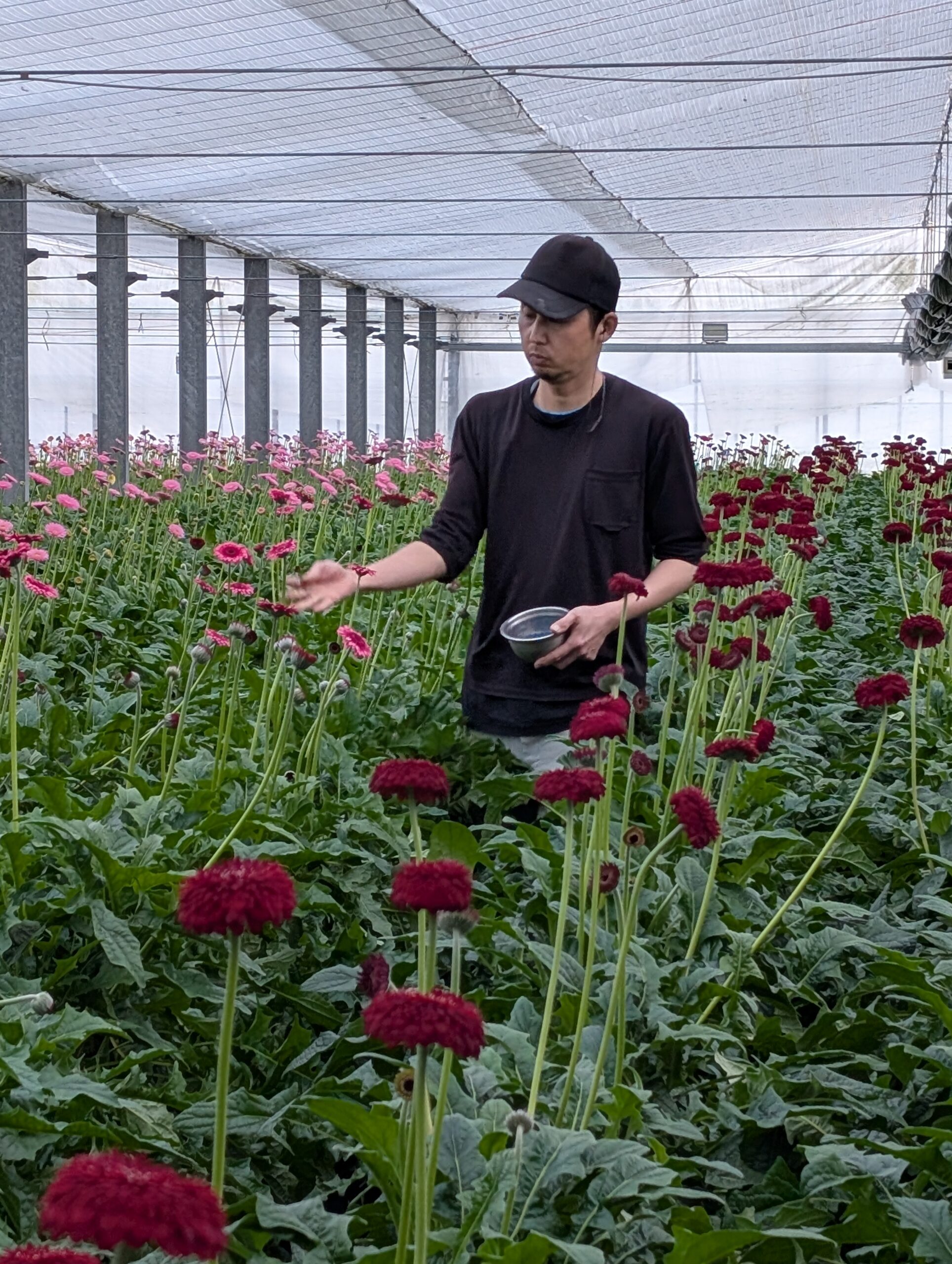 今日は朝から晴れ。気温は4 °c。今日も朝からガーベラの採花と調整作業をしました。昨日 L を切っていたのと、日が短くなったのとで花も少なく、今日もギリギリ午前中に終わりました。農園主は花を切ってから、パイプハウスの薬散をしました。薬散が終わってから、炭酸ガス発生装置の灯油を補充しました。この前から灯油が無くなっていたみたいです。炭酸ガスのおかげか、パイプハウスは調子がいいです。テラジーナがムダに咲いています。イギーとメラニーの茎も伸びてきました!