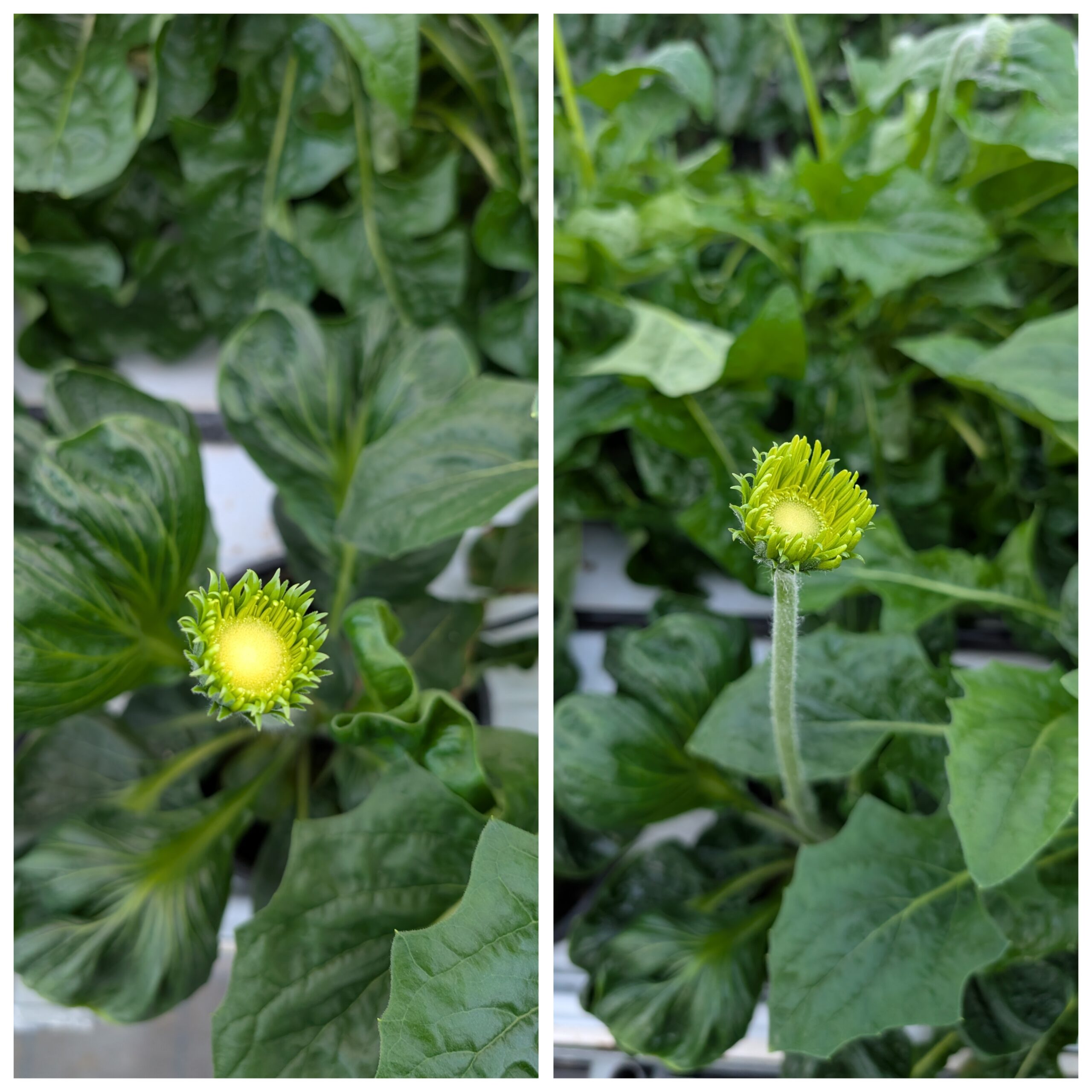 調整作業が終わってから、私と母親でフラウと新植ガーベラを切りました。農園主が、午後から新しいガラス温室を薬散していたので、ズボンがビチャビチャになりましたよ。葉っぱがガチガチのイスラエルの試作品種が咲いてきました。⇓