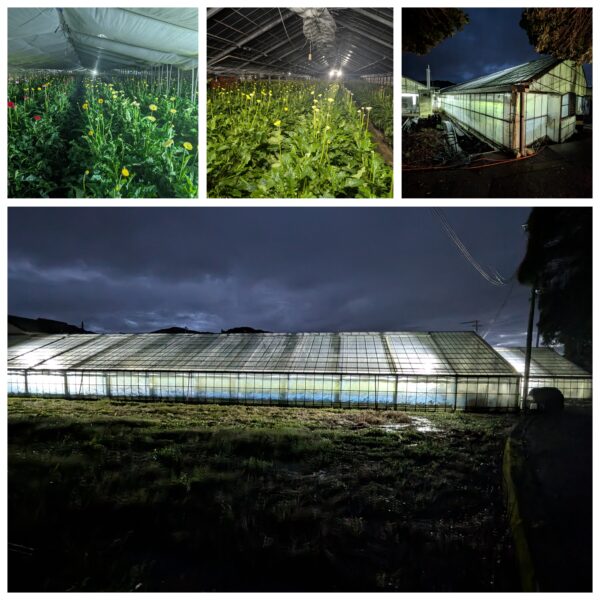 今日は朝から雨気温は19°c。今日は早朝からガーベラの出荷をし、それからいつものように採花と調整作業をしました。私は日曜、パイプハウスにバケツを置いてから、40年もの温室に行きます。昨日、電気屋さんがパイプハウスと広い方の40年もの温室にLED を設置してくれました。今日はワクワクしながらスイッチをオンにしました。ピカッと LED が光り、まぶしいぐらいです。が、しかし、スイッチが加温機の煙突掃除の時に外す部分にしっかりついていたので、これはスイッチの場所を変えてもらわないと!と思いました。広い方の40年もの温室のスイッチもオンにして外から見たら、かなり幻想的になりました。⇓