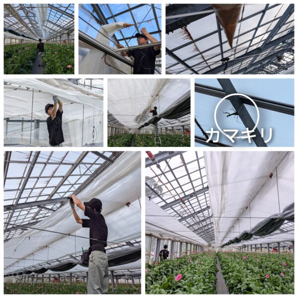 午後からは少し昼寝をして、私と農園主で作業場の隣のガラス温室の遮光カーテンの張り替えの続きをしました。1山目の一番東側のカーテンを乗せて、それから黒のプラスチック部材でカーテンのロープ部分を留めていきました。新しいカーテンは真っ白で、かなり温室内が明るくなりそうです☆⇓