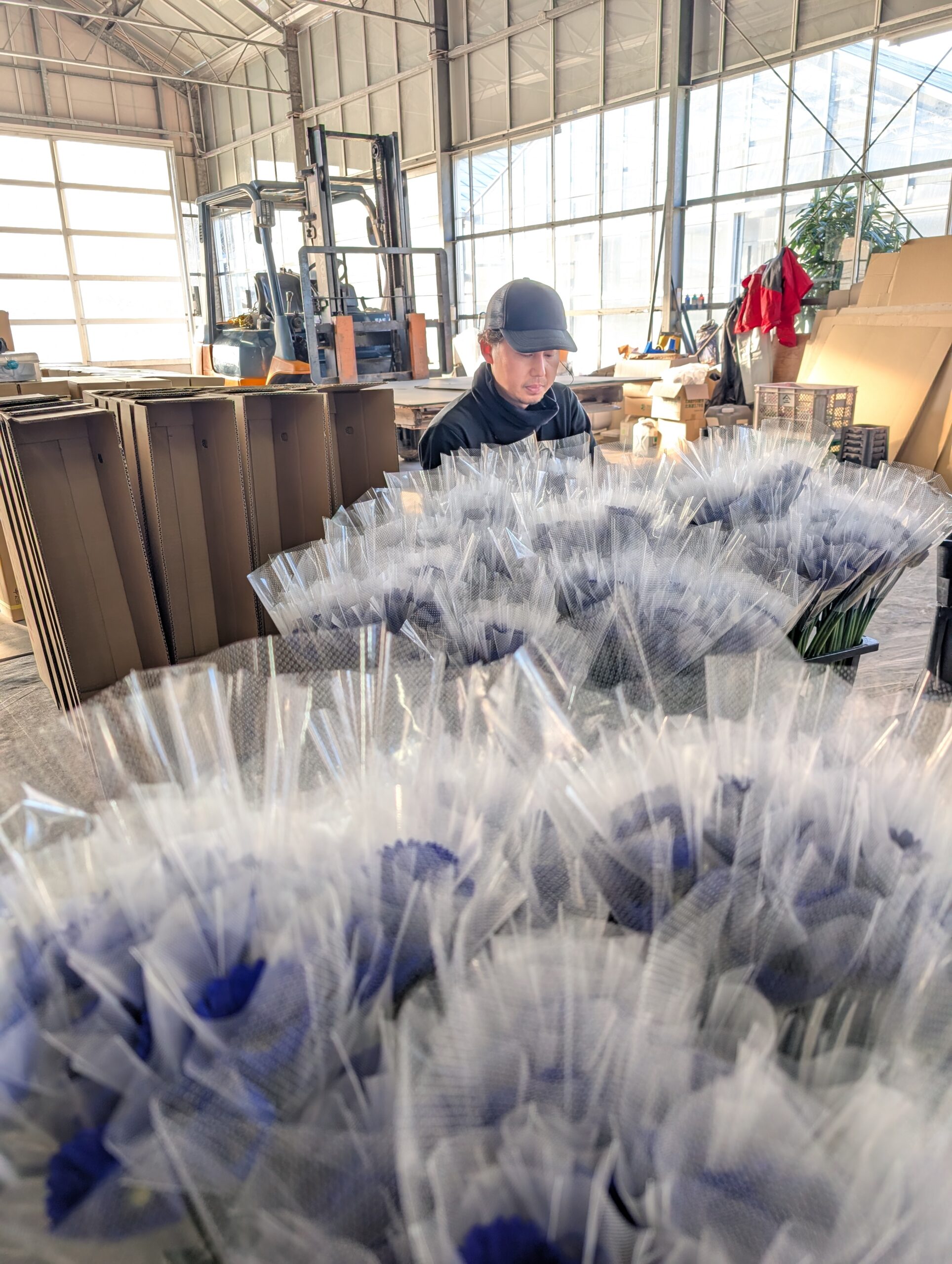 最近暖かくなってきて、ロイヤルブルーに染めた花びらの先が、濃くなってしまうヤツが出てきました。真冬は、1日以上ブルーの染め液につけておいても、変な感じになりません。温かい日が多くなり、次の日の昼過ぎまで浸けておくと、染まり過ぎます。しかも、花びらもフニャっとするような気がします。いつも農園主が、最適なタイミングで染め時間を調節しています。