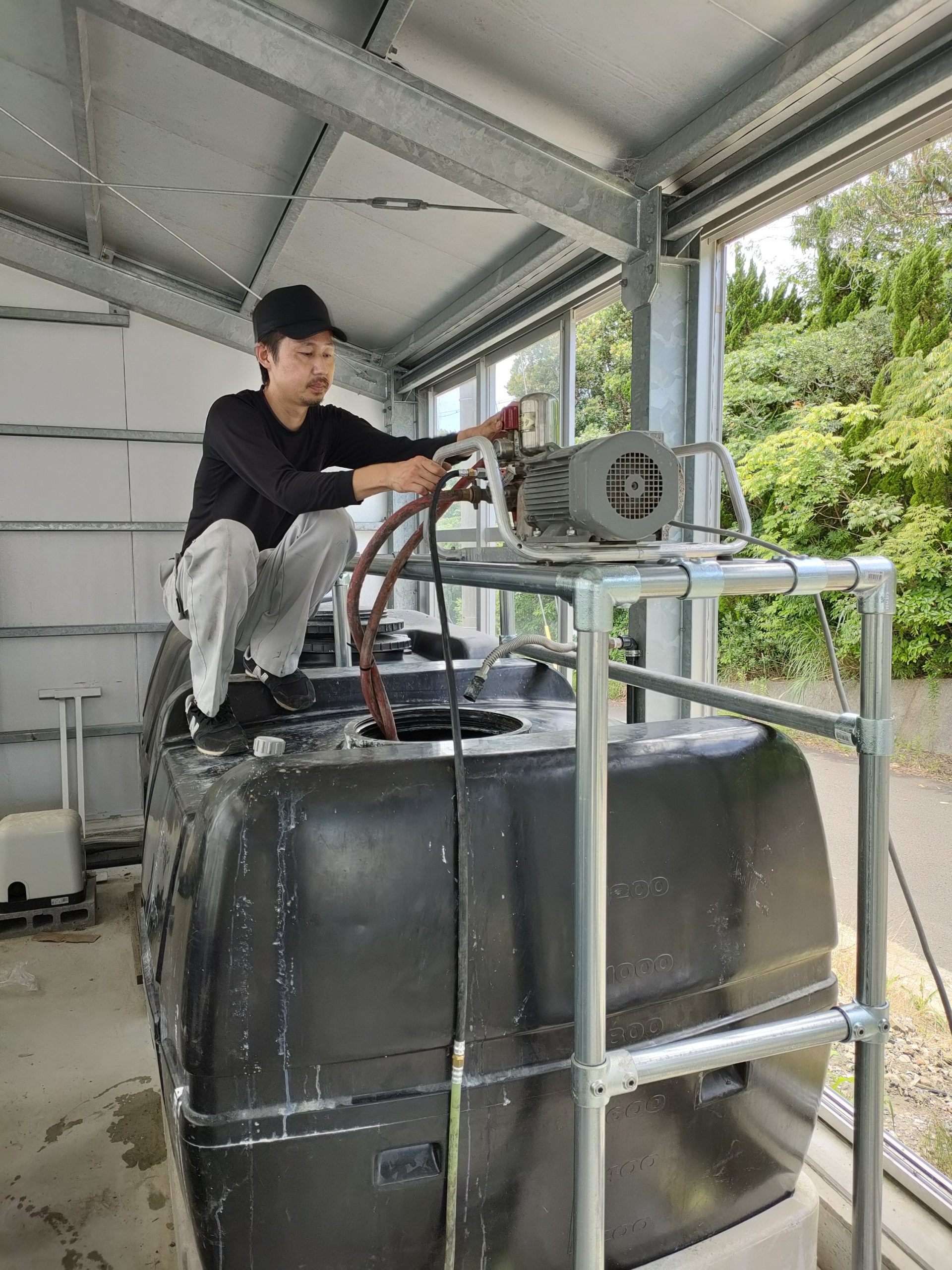 ミスト機の取り付けは8月4日からなので、今日はそのための準備をしてみました。温室の隣の機械室にミスト機に使うタンクを設置する予定です。少しでも機械室を広く使うため、薬散用の動噴を農薬を溜めるタンクの上に設置しました。見た目を良くするため、ホームセンターで単管パイプを購入して台を作りました。ちょっとお金がかかりますが、しっかりした台が組み立てられるのでおすすめです。