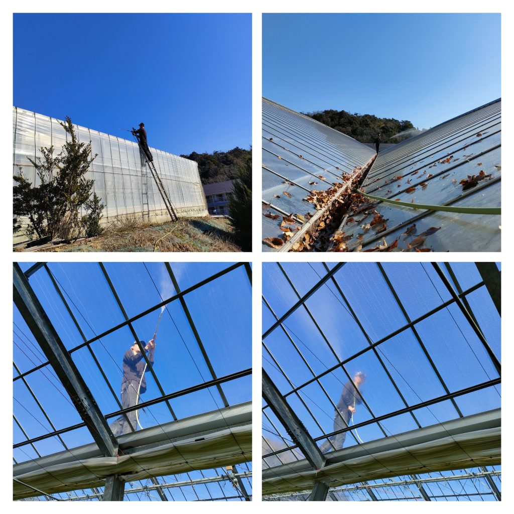 まずは、東西に建っている温室の一番南側の屋根から吹き付けていきました。